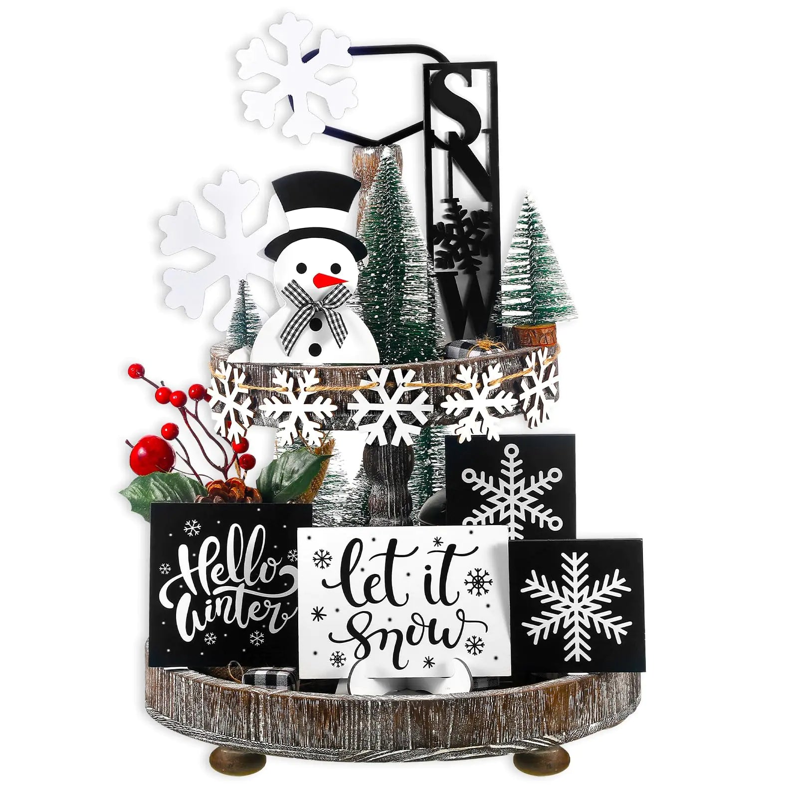 Enhance your home with the charm of winter using this comprehensive 15-piece décor set. Perfect for bringing festive joy to any space, this set does not include the tiered tray but comes packed with must-have items for a complete holiday arrangement.