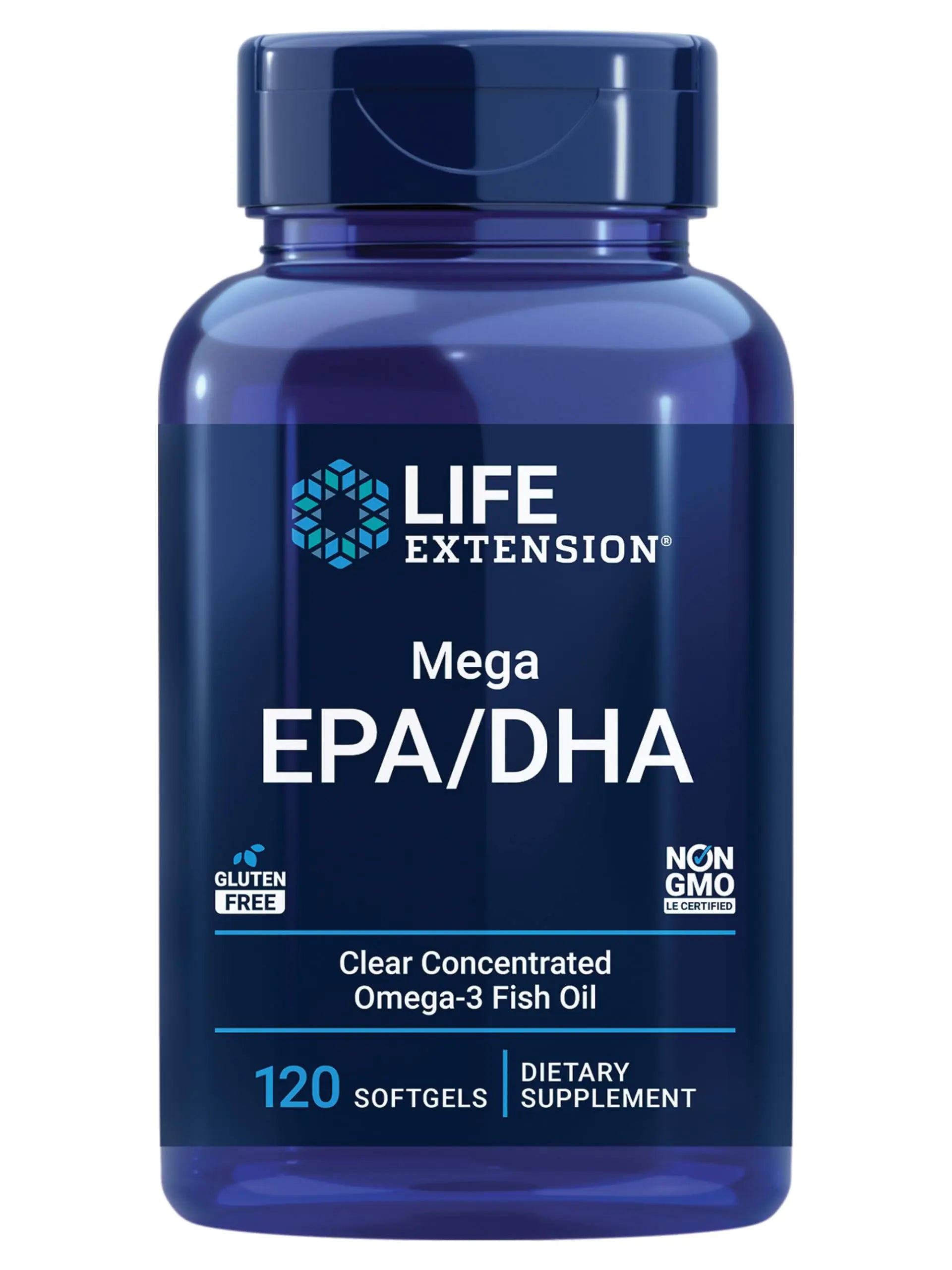 Life Extension Mega EPA/DHA Omega-3 Fatty Acids – a premium choice to support your heart and brain health. Each bottle contains 120 non-GMO, gluten-free softgels rich in EPA and DHA, essential nutrients known for reducing inflammation and promoting cardiovascular health for a longer, healthier life.